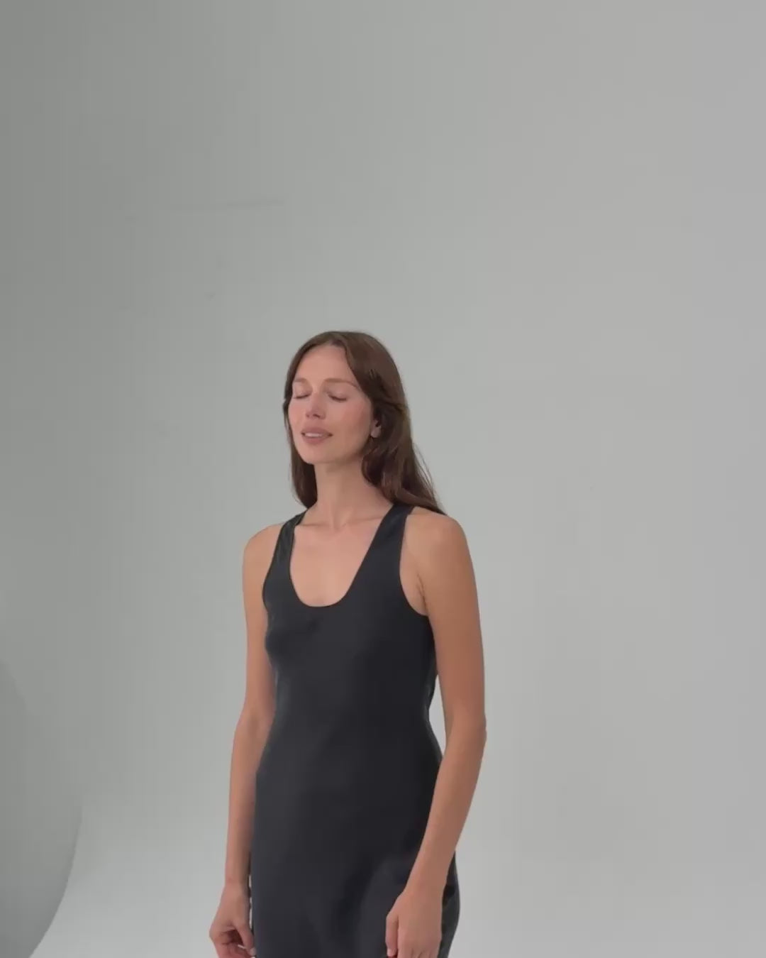 An effortlessly chic dress, designed with a flattering U neckline and a slight racer back for a modern touch. The dress is cut on the bias, allowing for a natural, hourglass drape. An open side slit adds movement, while its midi-maxi length balances elegance and ease, perfect for both casual and semi-formal occasions.
